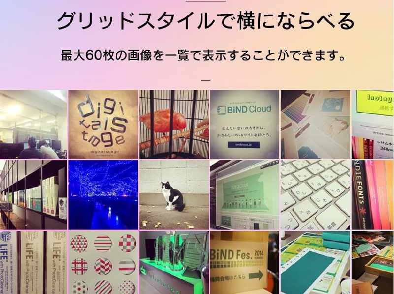 画像共有サービスで人気の高い「Instagram」とBiNDを連携し、「Instagram」に投稿した写真をBiNDで作成したサイトでリアルタイムに表示することができます。アルバムのレイアウトは自由に設定できるので、一覧表示にしたり、ビルボードに設置したりなど、さまざまな使い方ができます。