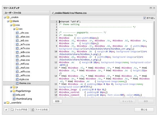 CSSやjQueryプラグインをBiNDクラウド上で直接編集できるリソースエディタ機能を搭載しました。この機能を使えば、画像やムービー、サウンドファイルなどのBiNDに搭載されていないファイルを使うことが可能になります。書き方の構文に誤りがあると、マークしてお知らせされるので、安心して使えます。