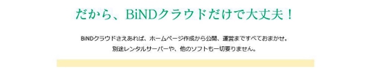 キャンペーン・サイトの主旨 PCとインターネット接続環境さえあればHP制作経験が無くてもホームページが作れてしまう。 しかもビジュアルでプロ並みのホームページを作れて、Web公開サーバー付ツールシステムが月480円から。 BindCloud 月480円から(1年間無料サービスベーシックのみ) 初年度 1年間無料使用ができるクーポンをプレゼント中 (2目より月額480円のライセンス費用が掛かります。)